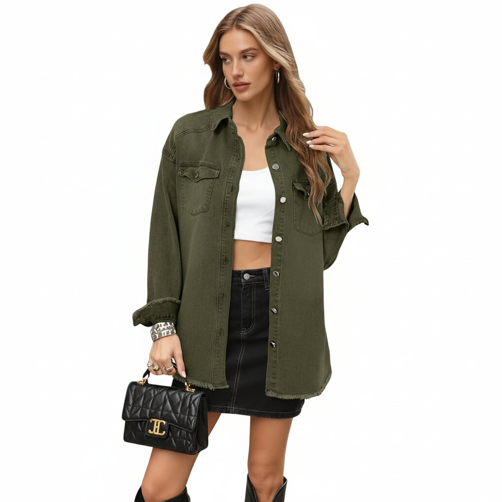 UEAL Women's Oversized Button Down Frayed Hem Denim Shacket Casual Long Sleeve Jean Jackets 2026 Spring Outfits- Elm Green