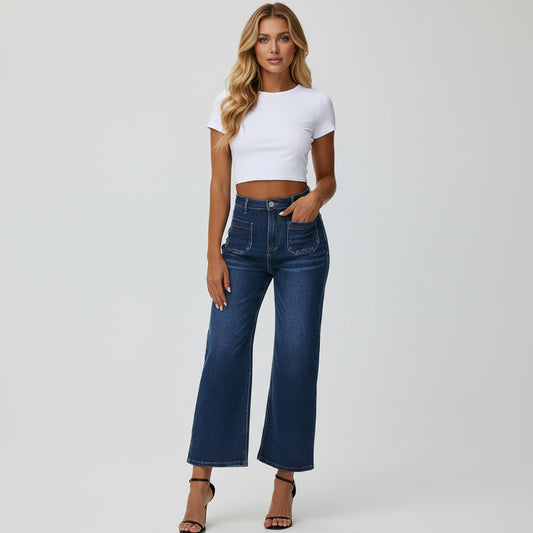 Genleck Women's Wide Leg Cropped Leopard Jeans- Midnight Blue
